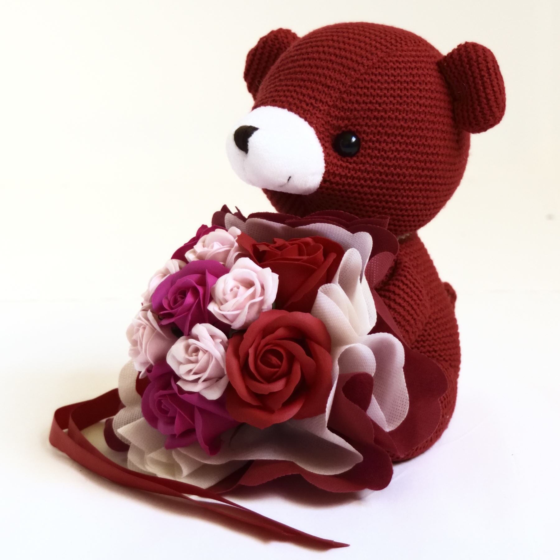 可愛い笑顔のくまちゃんが赤とピンクのバラの花束を持ってちょこんと座っています。