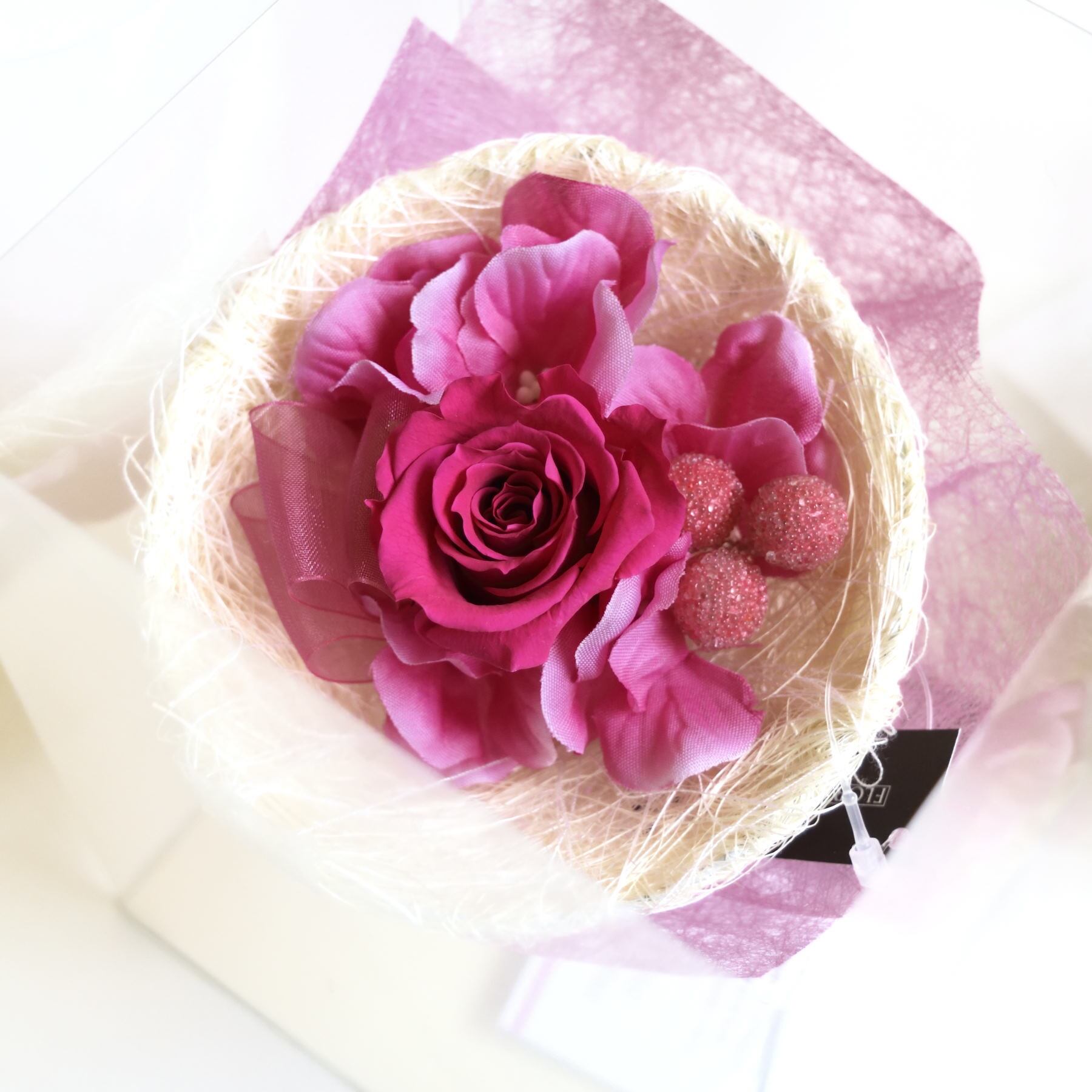 プリザーブドフラワーとアーティフィシャルフラワーをあしらってリボンを飾り麻と透明感あるフラワーペーパーでまとめた可愛いらしいブーケです。